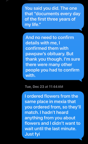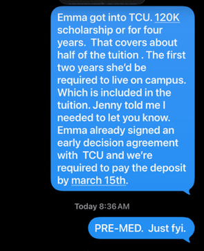 The deposit for TCU was due on March 15th or so, and my mother was aware of this. You’ll never guess what she decided to do about two days before the due date: she did what she does best—ghosted me. She ignored my texts. My husband and I paid the deposit. If “E” can’t attend TCU, it’s definitely not going to be because the deposit wasn’t paid. But at the same time, if I tell my mother that we paid the deposit, she will absolutely make sure “E” doesn’t attend TCU.